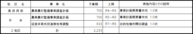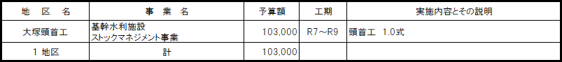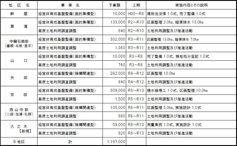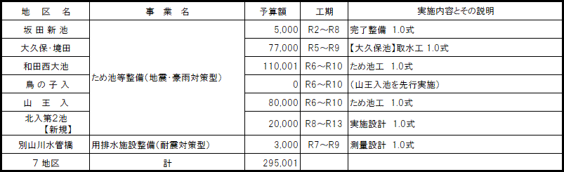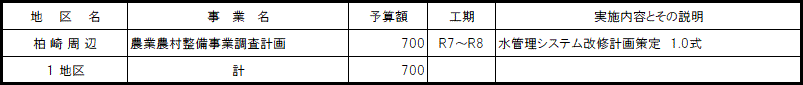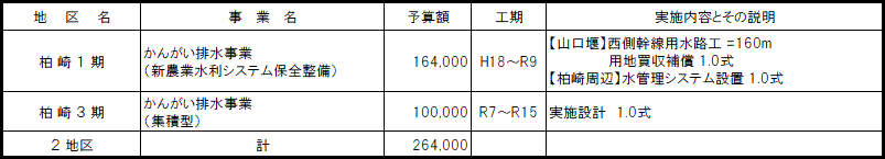 国営事業によるダム建設工事は既に完了していますが、今後もこのダム用水を受益地に配水するための関連工事を引き続き行っていきます。本年度より市野新田ダムの用水を別俣地区へ配水するため『柏崎3期地区』が新規地区として事業に着手します。